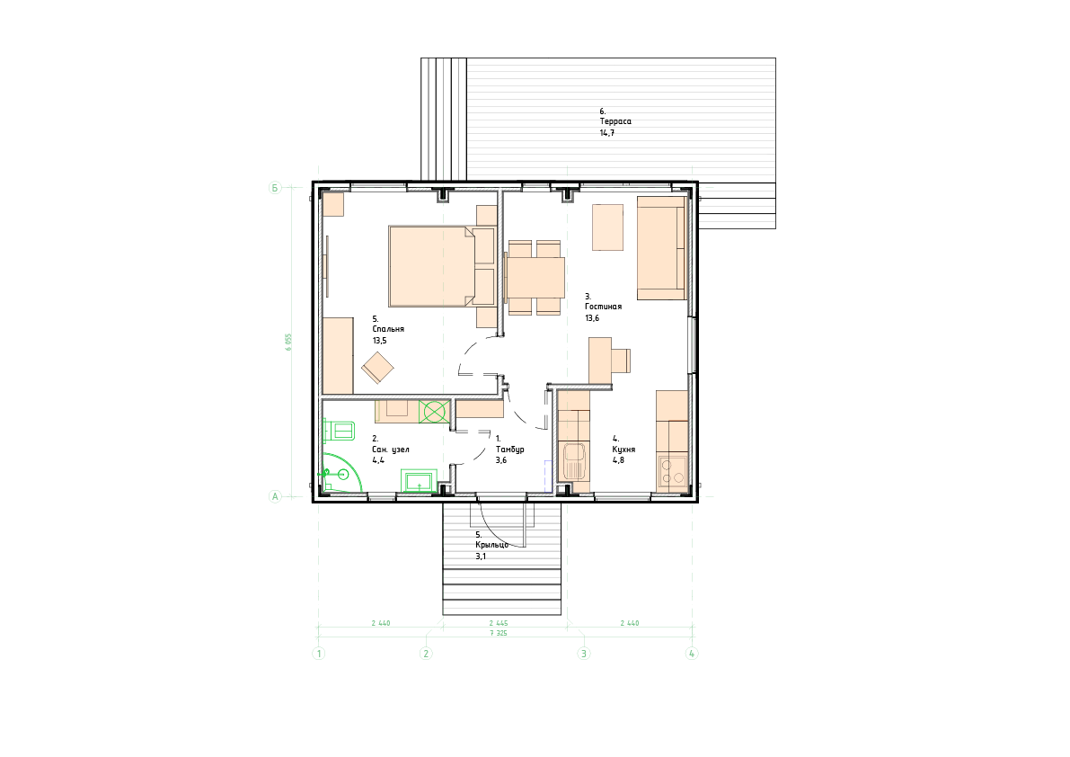 Модель "ULTRA 44" представляет одноэтажный дом современного дизайна общей площадью 44 квадратных метров. Этот компактный и экономичный вариант отлично подходит для маленькой семьи или пары, ищущей уютное и функциональное жилище.